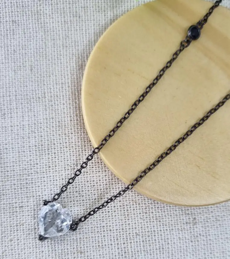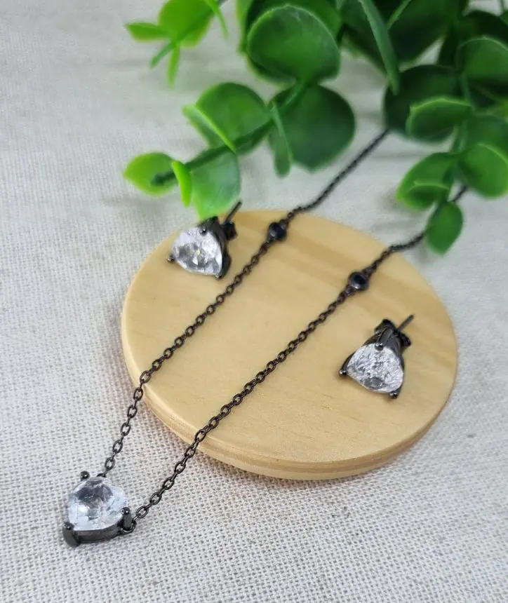 Conjunto colar e brinco coração. Em prata 925 com banho de Ródio Negro com 45cm de comprimento + 5cm de extensor. Pingente de coração zirconia tradicional medindo 1cm, trazendo na corrente quatro ponto de luz de zirconia black. O brinco medindo 2cm de comprimento e 0,8cm com fecho tradicional.